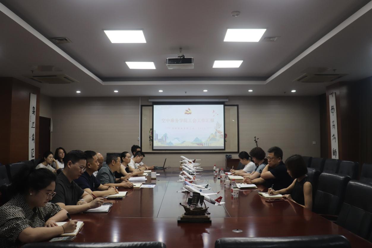 于主席详细询问了学院在学科专业建设、教育教学、学生管理、职工福利及教师职业发展规划等方面的情况。空乘学院党委书记胡涛、院长姚建明分别汇报了学院历史沿革及现状、党建工作、教职工队伍情况、学科建设、人才培养成果以及当前发展面临的主要挑战等情况,工会主席蒋晓瑜就学院工会工作进行了专题汇报。